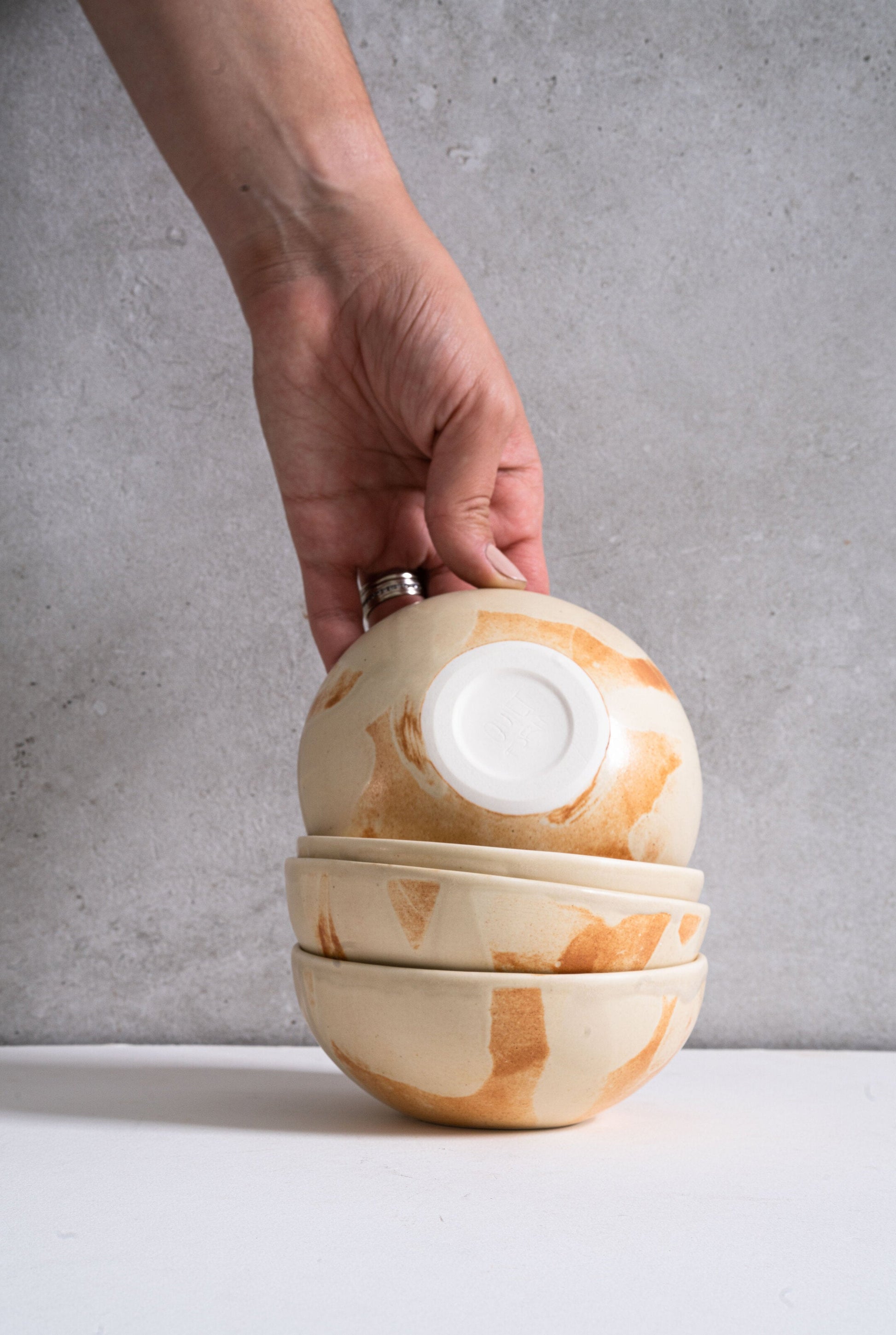 Beige matte stoneware bowl brings pottery vibes to mealtime. Hand-dipped in a reactive glaze that swirls uniquely across each piece and leaves beautiful rust color strokes. Open form and simple style only add character to this dinnerware.