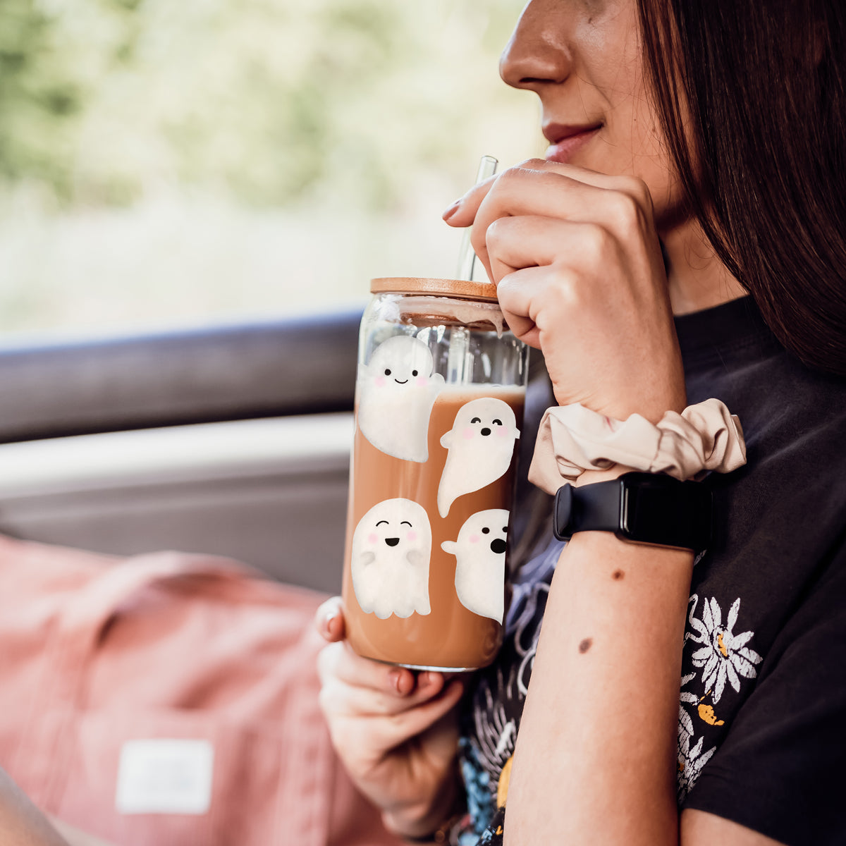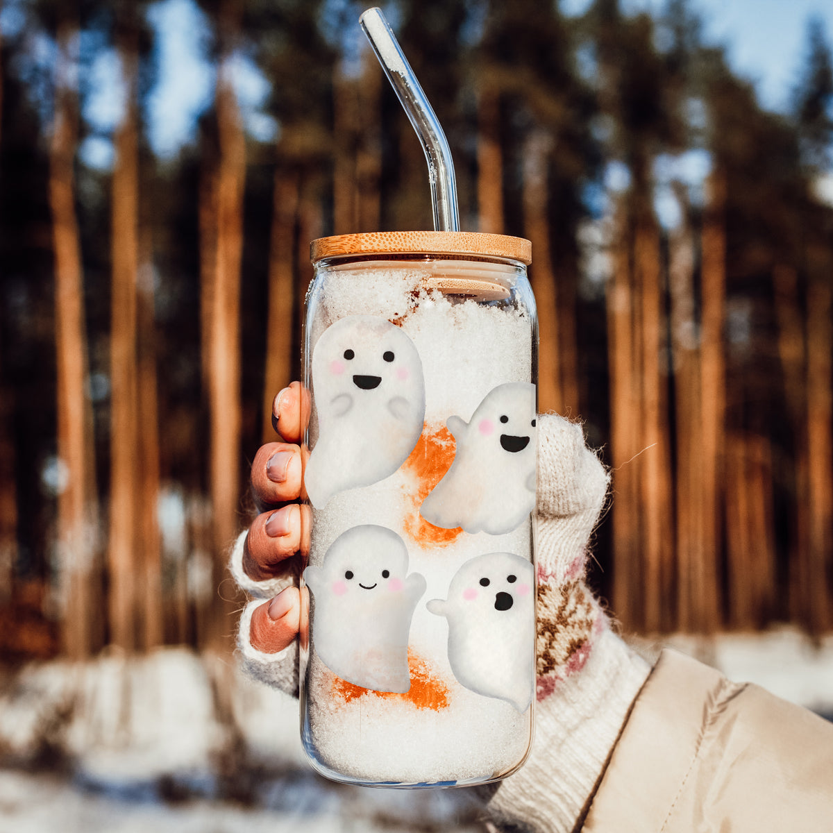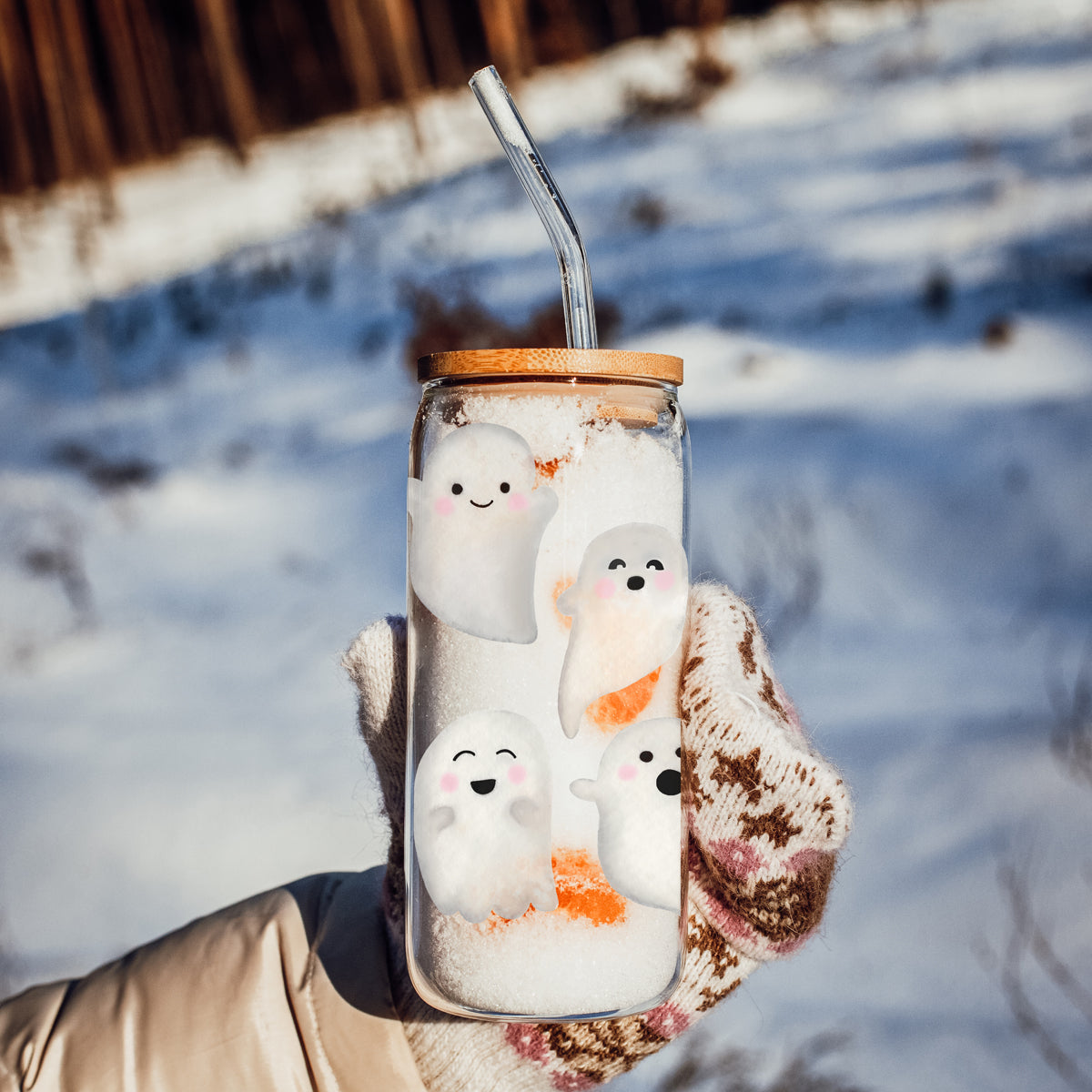 Meet the tumbler that's more charming than scary - featuring a delightful squad of friendly ghosts who are here to make your beverages absolutely enchanting! This 20oz glass tumbler proves that being spooky can also be totally adorable.