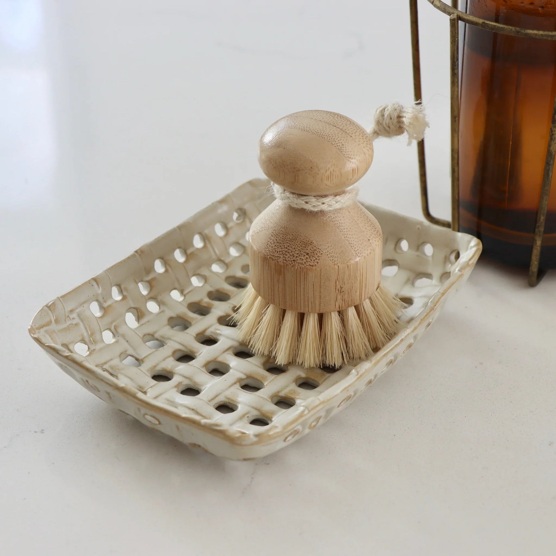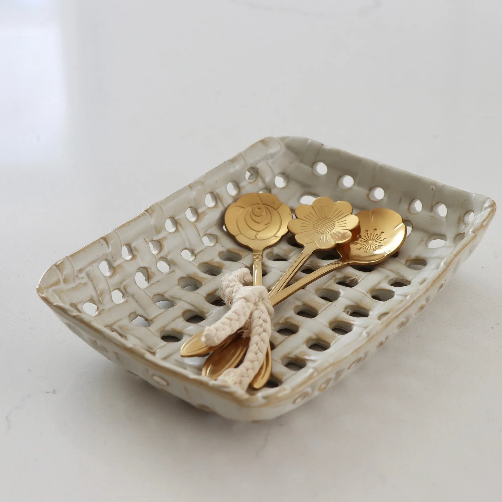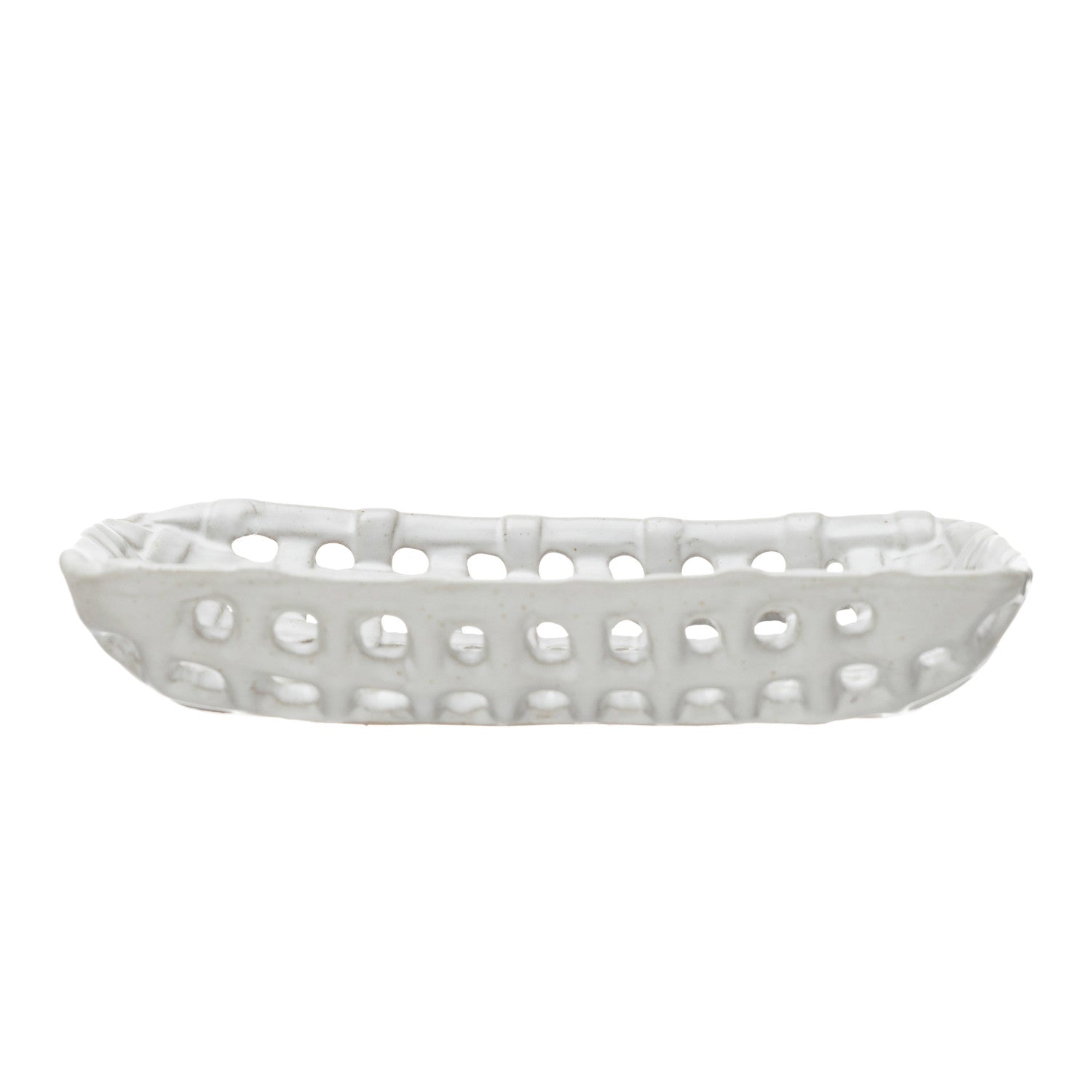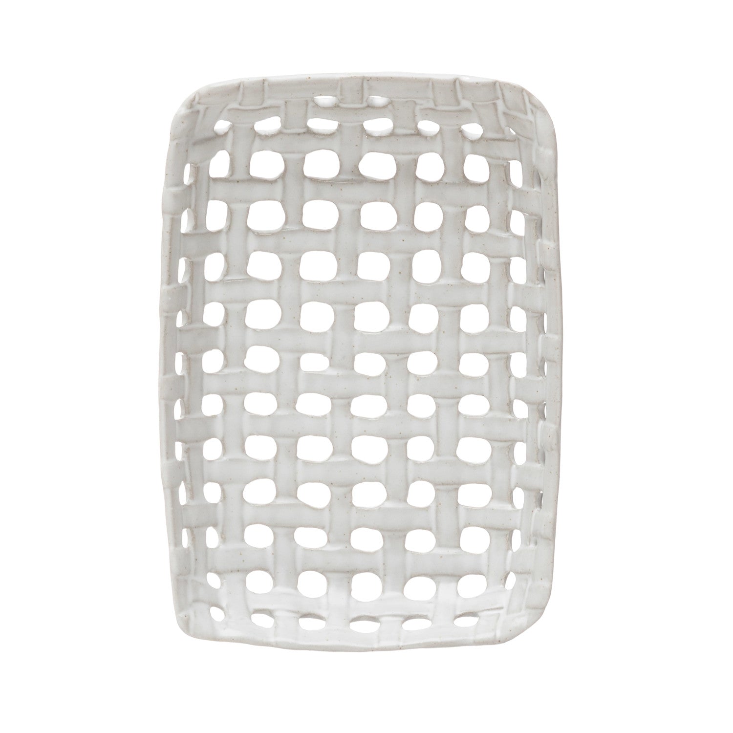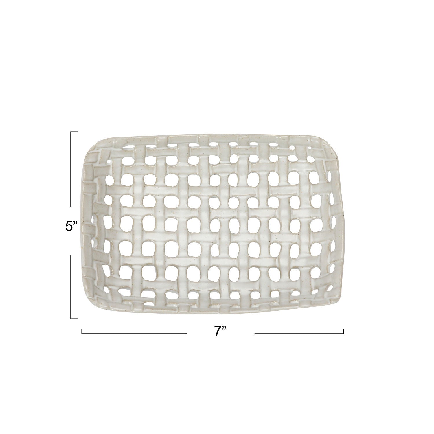 Lovely in the kitchen or bath, this ivory/cream-colored Lattice Stoneware Basket Dish is excellent for collecting beauty supplies, dish brushes, and silverware. We love the clean, crisp glaze and the open "weave" that allows items to dry quickly. We appreciate that it's easy to wash, too, since it's ceramic.