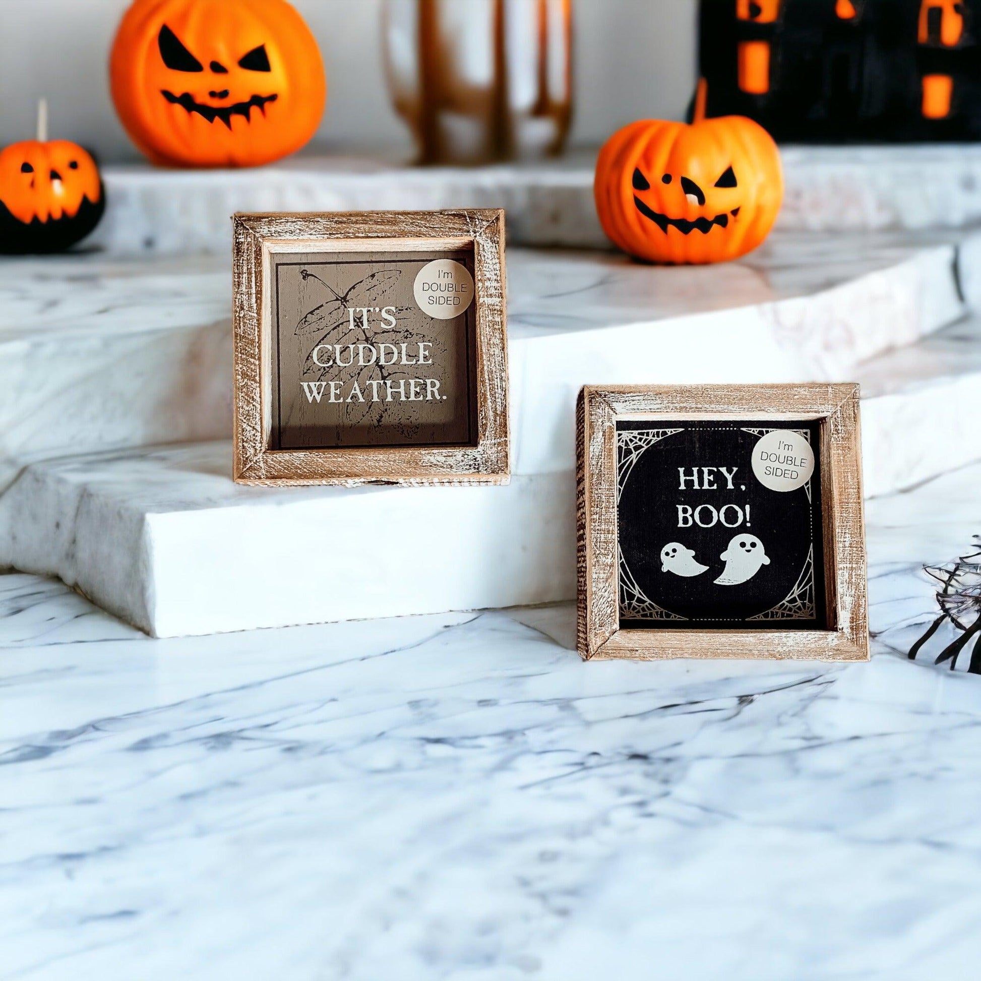 Once fall hits, display "It's Cuddle Weather." When Halloween is around the corner, turn it over to display the "Hey Boo" Side. Then once it's passed turn it back around to "It's Cuddle Weather!"