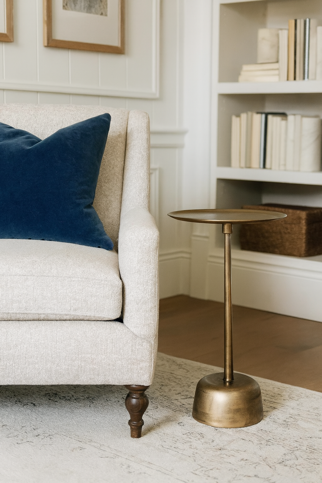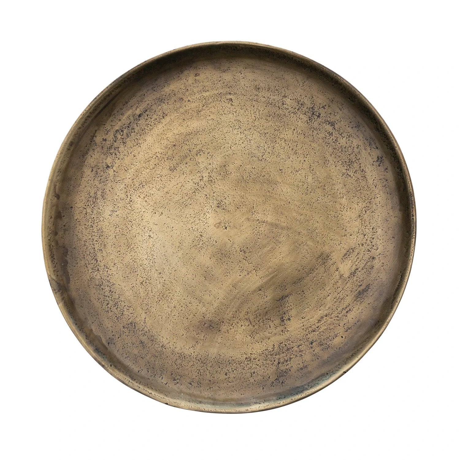 This sleek and elegant side table features a pure aluminum top with a thin stem and an antique brass finish. It is made of lightweight and durable metal that has a smooth and polished surface. The antique brass finish adds shine and sophistication to the accent table. This little table's size and shape make it suitable for any space, such as living rooms, bedrooms, or entryways.