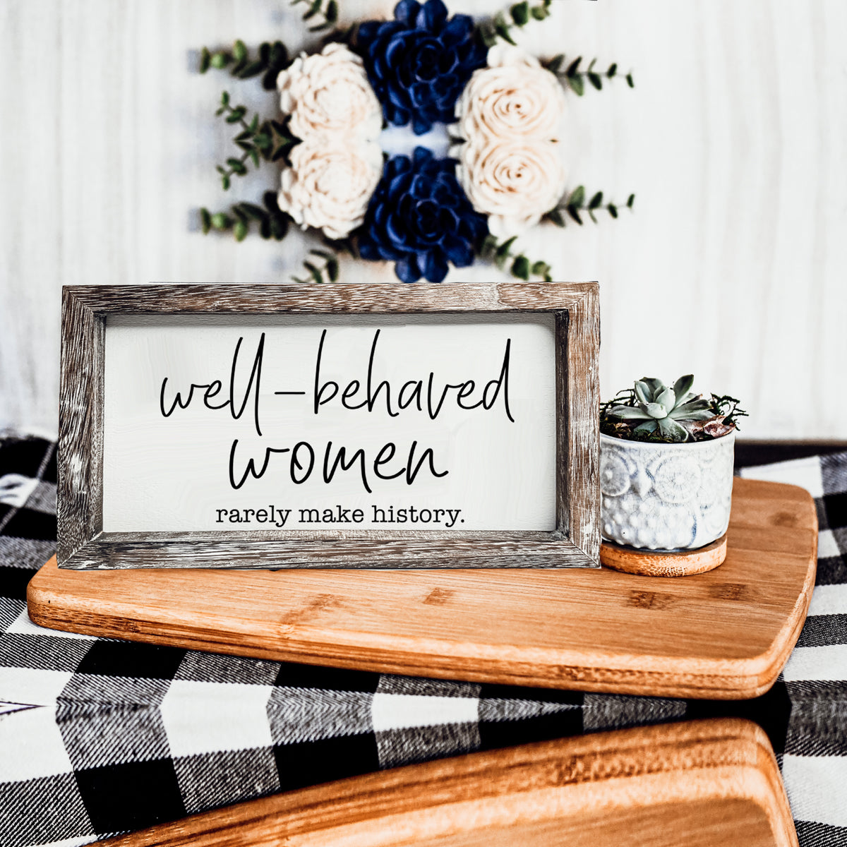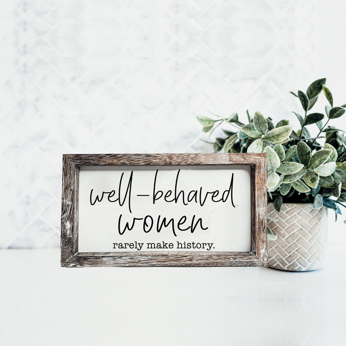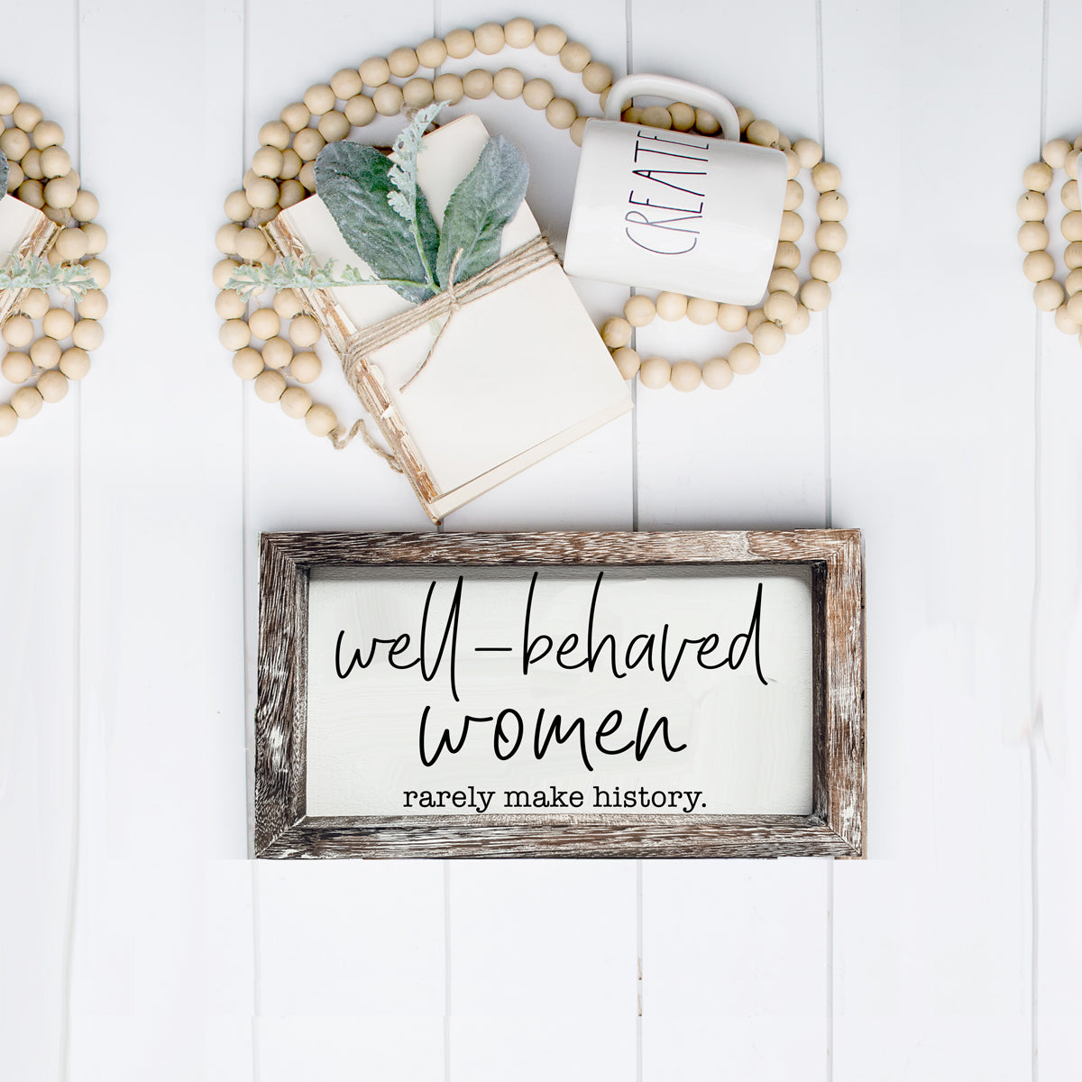 This stylish and empowering Well Behaved Women Sign is the perfect choice for any woman. Crafted with durable wood and a striking finish, it's a timeless reminder that history is made by those who break the rules. With its powerful message, it also makes a great gift for your favorite female trailblazer. Even if that trailblazer is you ;)