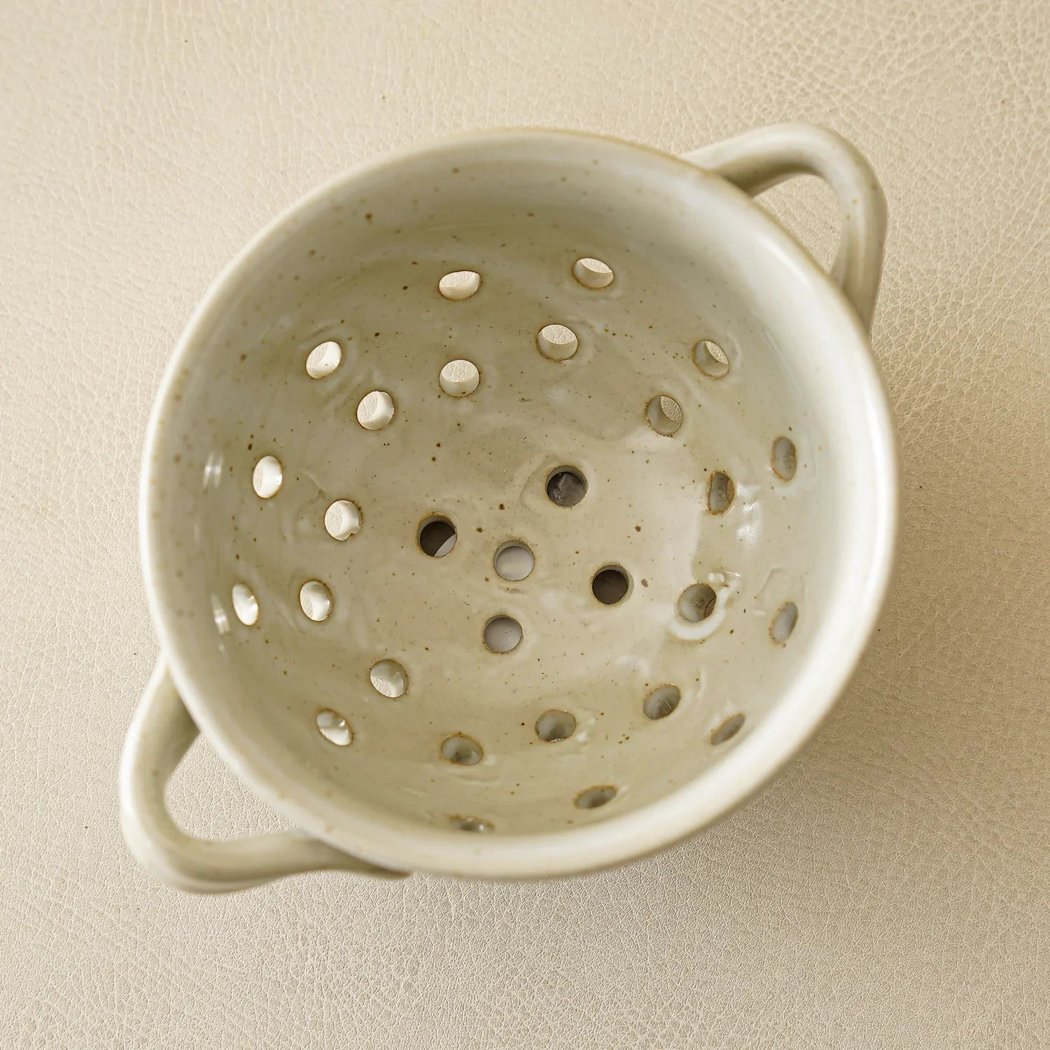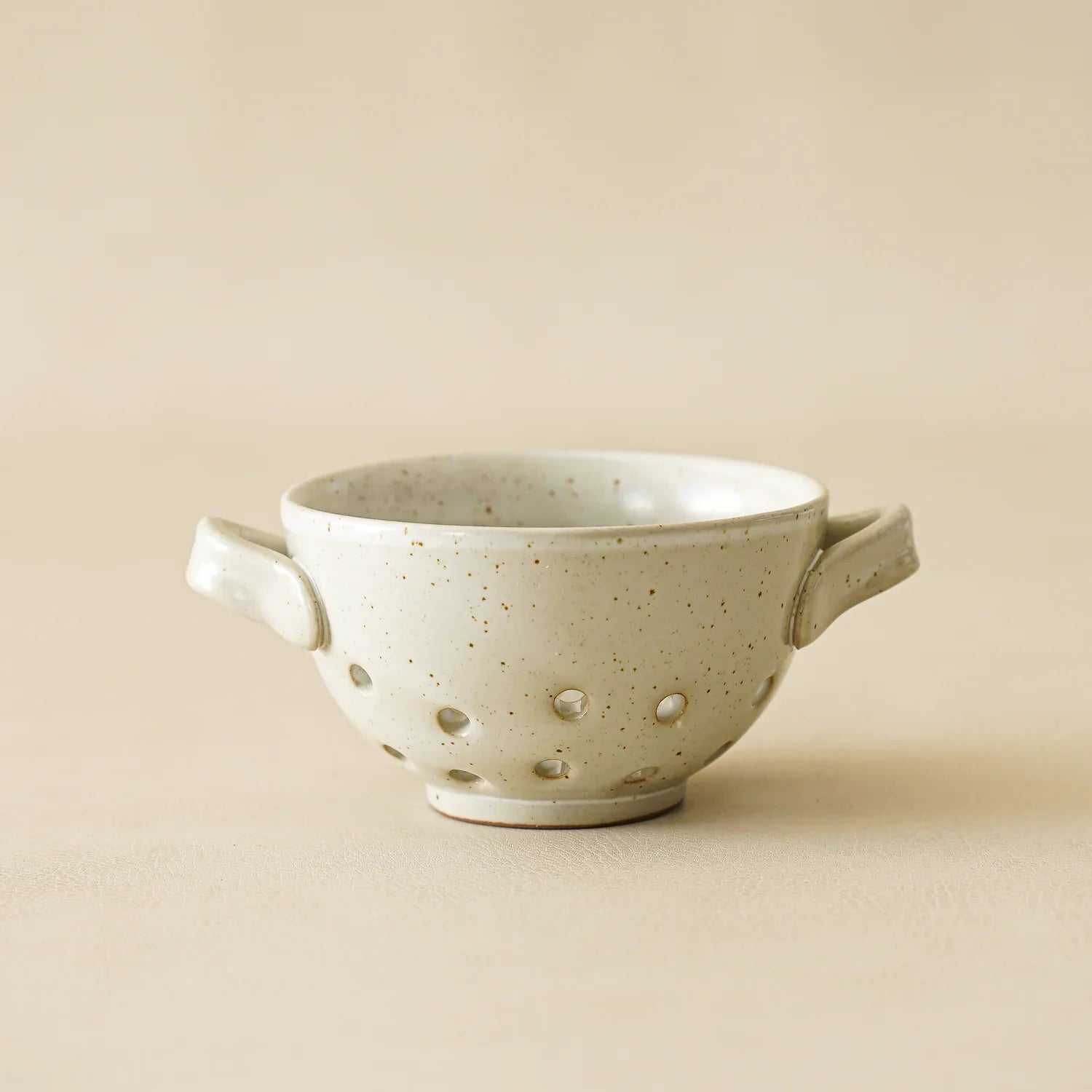 This stoneware berry bowl combines functionality with artisanal style. Crafted with a reactive glaze in a soft, speckled white, it’s perfect for rinsing fruits or serving fresh produce like a colander. The perforated design allows for quick draining, while the integrated handles provide a secure grip. Ideal for use in the kitchen or as a decorative piece on open shelving.